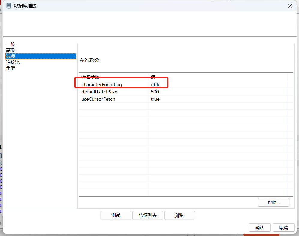 2.在‘选项’ 选项设置的命令参数框增加characterEncoding,将值设为gbk,如图片所示