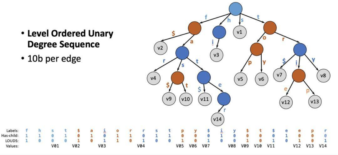 数据结构中的Trie (前缀树) 结构能够让共同前缀只存一份,避免重复存储带来的浪费。但是传统前缀树结构中,从一个节点到下一个节点的指针占用空间太多,整体而言得不偿失。这一情况有望用 Succinct Prefix Tree 来解决。SIGMOD2018年的最佳论文 Surf 中提出了一种用 Succinct Prefix Tree 来取代 bloom filter,并同时提供 range filtering 的功能。我们从这篇文章得到启发,用 Succinct Trie 来做 file block index。