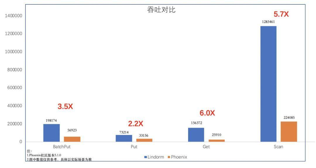 相比于关系数据库的SQL,Lindorm不具备多行事务和复杂分析(如Join、Groupby)的能力,这也是两者之间的定位差异。相比于HBase上Phoenix组件提供的二级索引,Lindorm的二级索引在功能、性能、稳定性上远远超过Phoenix,下图是一个简单的性能对比。