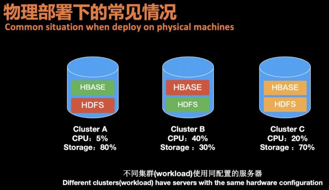 - 存储和计算绑定,灵活性差:物理机上CPU和磁盘的比例都是一定的,但是每个业务的特点都不一样,采用一样的物理机,有一些业务计算资源不够,但存储过剩,而有些业务计算资源过剩,而存储瓶颈。特别是在HBase引入混合存储后,HDD和SSD的比例非常难确定,有些高要求的业务常常会把SSD用满而HDD有剩余,而一些海量的离线型业务SSD盘又无法利用上。