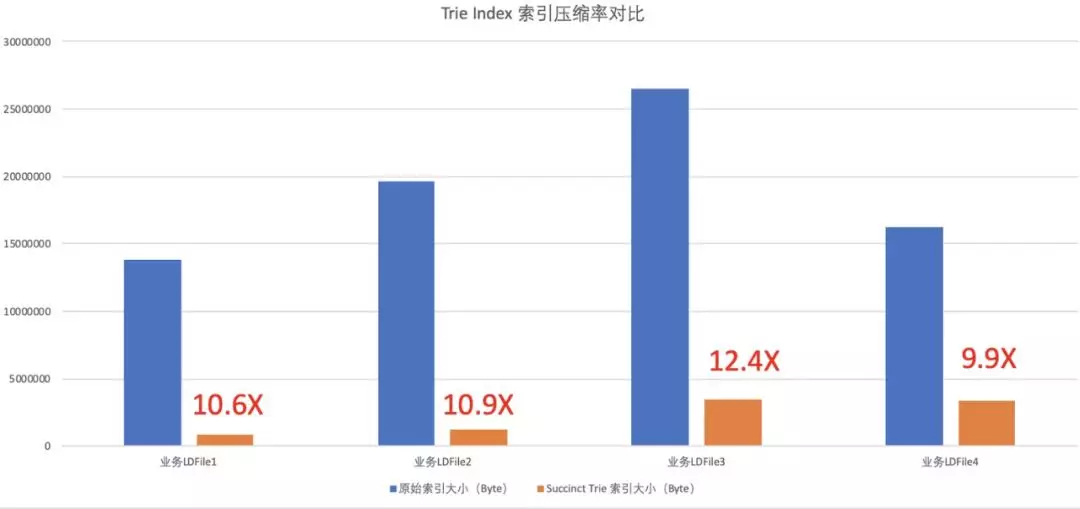 我们在线上的多个业务中使用了Trie index实现的索引结构。结果发现,各个场景中,Trie index可以大大缩小索引的体积,最多可以压缩12倍的索引空间!节省的这些宝贵空间让内存Cache中能够存放更多的索引和数据文件,大大提高了请求的性能。