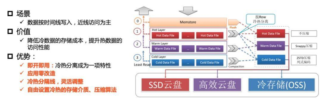 Lindorm在同一张表里实现了数据的冷热分离,系统会自动根据用户设置的冷热分界线自动将表中的冷数据归档到冷存储中。在用户的访问方式上和普通表几乎没有任何差异,在查询的过程中,用户只需配置查询Hint或者TimeRange,系统根据条件自动地判断查询应该落在热数据区还是冷数据区。对用户而言始终是一张表,对用户几乎做到完全的透明。详细介绍请参考:https://yq.aliyun.com/articles/718395