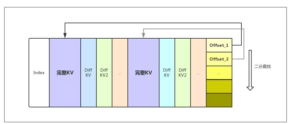 从性能角度考虑,HBase通常需要将Meta信息装载进block cache。如果将block大小较小,Meta信息较多,会出现Meta无法完全装入Cache的情况, 性能下降。如果block大小较大,经过Encoding的block的顺序查询的性能会成为随机读的性能瓶颈。针对这一情况,Lindorm全新开发了Indexable Delta Encoding,在block内部也可以通过索引进行快速查询,seek性能有了较大提高。Indexable Delta Encoding原理如图所示: