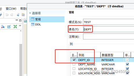 右键点击【DEPT】表,把【DEPT_ID】列名设置为主键(如果建表时,未定义主键,可以用次方式实现)。