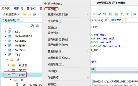 右键点击【EMP】表,选择【修改】,进入表修改界面(如果建表时,未定义主键,可以用次方式实现)。