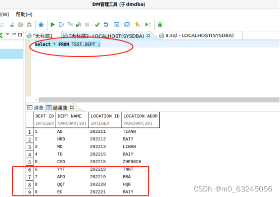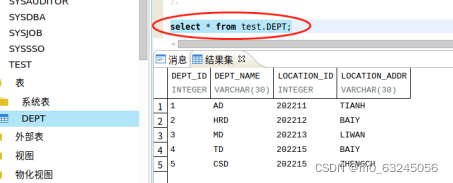 通过 SELECT * FROM TEST.DEPT ,查看录入信息