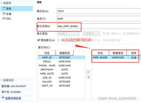 界面弹出【新建索引】对话框,在【索引名称】填写IND_EMP_NAME,在【索引列】把左边EMP_NAME迁移到右边框中,具体如下图