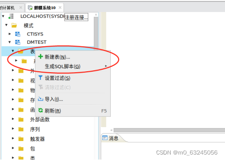 右击选择【DMTEST】模式里面的【表】,在左点击【新建表】