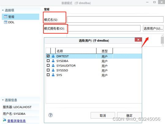 输入模式名称【TEST】和模式拥有者【DMTEST】