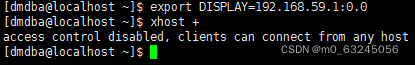 4.在dmdba用户下执行export DISPLAY=192.168.59.1:0.0及xhost + 进行图形化启动前最后配置
