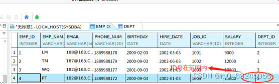 通过语句,查看【DEPT】表【DEPT_ID】列存在5个ID号;如果我们对【EMP】表进行路径录入时,该表会检查【DEPT_ID】的ID号是否与包含在【DEPT】表【DEPT_ID】列的5个ID号内,如果包含数据可以录入,反之系统就会报错,具体如下图演示: