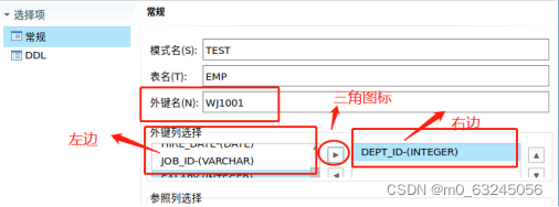 命令:alter table "TEST"."EMP" add constraint "WJ1001" foreign key("DEPT_ID") references "TEST"."DEPT"("DEPT_ID");