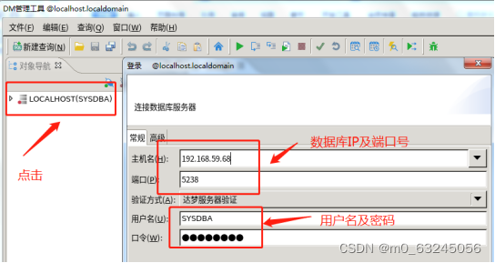 6.【manager】链接数据库实例。进入manager 管理工具登陆界面,点击【LOCALHOST(SYSDBA)】, 在右边填写数据库主机IP【192.168.59.68】、端口号【5238】、用户名【SYSDBA】和密码[Dameng123],如下图显示:
