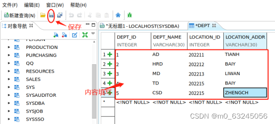 1.用SYSDBA用户打开视图(./manager)选择DMTES模式-表-新建表2.在表名中填写DEPT再右边点击 “+ ”进行列表添加3.右击DEPT表选择浏览数据数据类型4.数据内容填写,在按左边保存图标5.通过/dm8/bin/./disql 进行脚本导入6.外键约束及检查约束建立外键约束外键约束内容【EMP_ID为EMP表的外键,参照列为DEPT表的DEPT_ID列】...