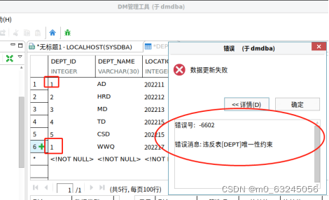如果【DEPT_ID】为主键,新录入数据【DEPT_ID】号不能与已存在的号相同,如是相同就会报错,如下图