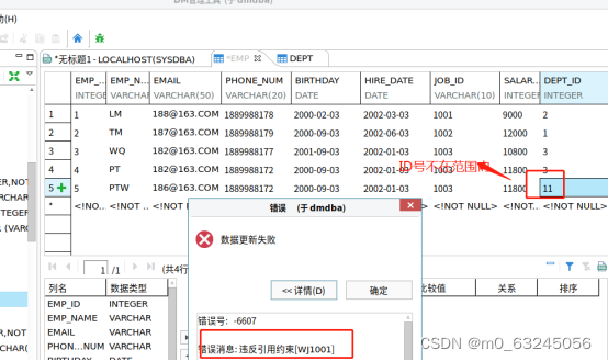 注释:如上图所示,新增加数据【DEPT_ID 】 等于1时,出现报错