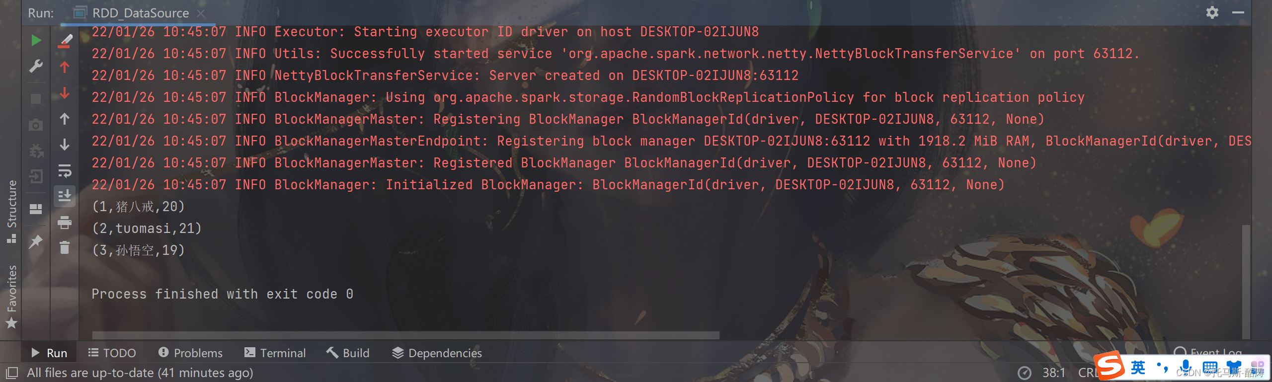val studentTupleRDD: JdbcRDD[(Int, String, Int)] = new JdbcRDD[(Int, String, Int)]( sc, getConnection, sql, 1, //id为1~20之间的记录进行提取 20, 1, mapRow )10、结果集处理函数