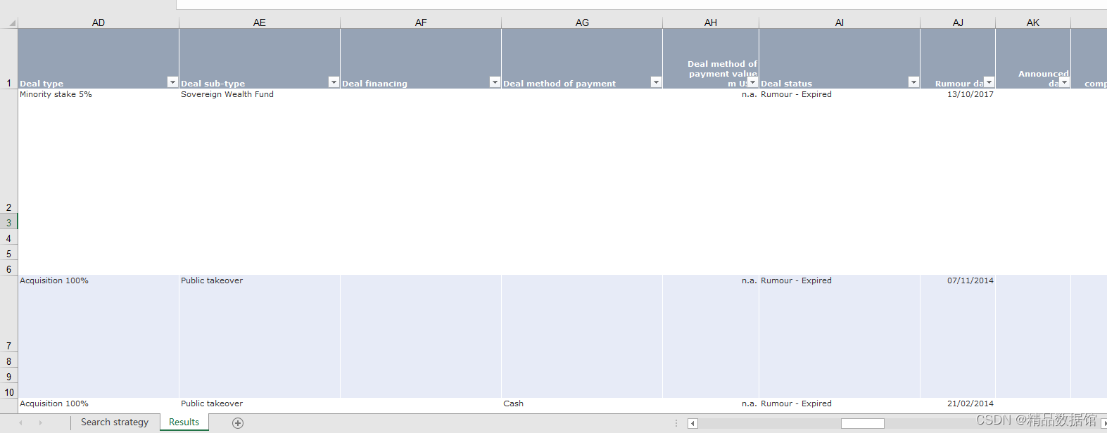 m USD" Deal status Rumour date Announced date Expected completion date Assumed completion date Completed date Postponed date Withdrawn date Last deal status date Last deal value, offer price, bid premium update date Last deal status update date Last % of stake update date Last acquiror, target, vendor update date Last advisor update date Last deal comment, rationale update date Last update "Deal value