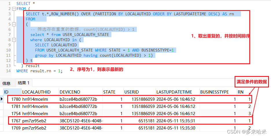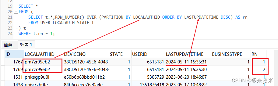这个序号是基于[LOCALAUTHID]字段进行分区的(即每个[LOCALAUTHID]值都是一个新的分区),并且在每个分区内部,行是按照LASTUPDATETIME字段降序排列的