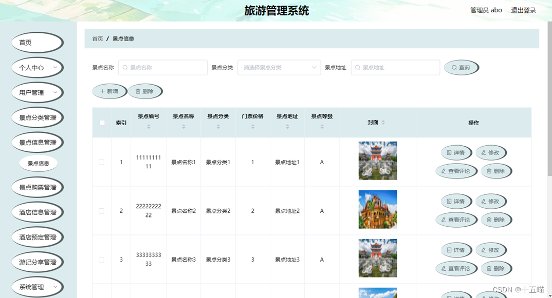 如图5.3显示的就是景点信息管理页面,管理员可以对景点信息信息进行添加,修改,删除,查询操作。