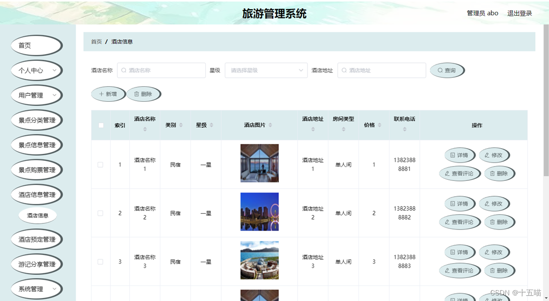 如图5.4显示的就是酒店信息管理页面,管理员可以对酒店信息进行添加修改删除查询操作。