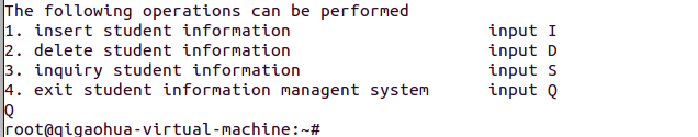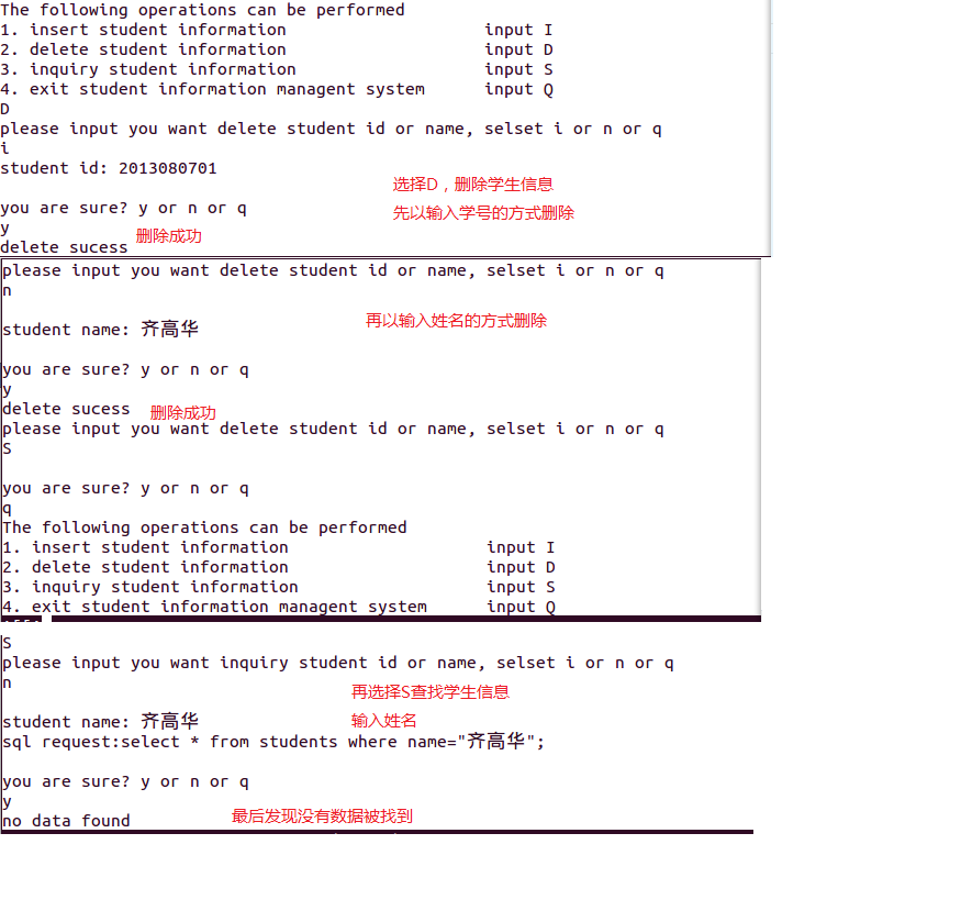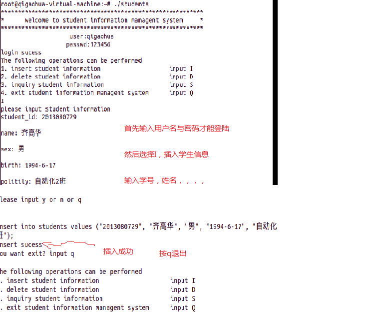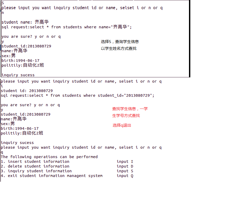 #include <stdlib.h> #include <stdio.h> #include <mysql.h> #include <ctype.h> #include <curses.h> //#define MAX_PASSWD_LEN 16 void printf_mune(void); char *getPasswd(void); int insert_student(void); int delete_student(void); int inquiry_student(void); int main(int argc,char** argv) { char user[20]; char passwd[20]; char c; int i; printf("***********************************************************\n"); printf("* welcome to student information managent system *\n"); printf("***********************************************************\n"); // printf(" user: ______________\b\b\b\b\b\b\b\b\n"); // printf(" psaawd:______\b\b\b\b\b\b\n"); while(1){ printf(" user:"); scanf("%s", user); printf(" passwd:"); scanf("%s",passwd); /* while ((c=getch())!='\n') { if (i<MAX_PASSWD_LEN && isprint(c)) //isprint函数判断c是否是可打印字符 { passwd[i++] = c; putchar('*'); } else if (i>0 && c=='\b') { --i; putchar('\b'); putchar(' '); putchar('\b'); } } putchar('\n'); passwd[i] = '\0'; */ if(!strncmp(user, "qigaohua", 8)){ if(!strncmp(passwd, "123456", 6)) break; else { printf("passwd error\n"); continue; } }else{ printf("user error\n"); continue; } } printf("login sucess\n"); while(1){ printf_mune(); getchar(); //问题1 必须加 c = fgetc(stdin); switch(c){ case 'I': insert_student(); break; case 'D': delete_student(); break; case 'S': inquiry_student(); break; case 'Q': return 0; break; default: ; } } printf("exit sucess\n"); return 0; } /*getc()和getchar()函数想必大家都经常用到,但它们都在输入的同时显示输入内容,并由回车终止输入。 为了不显示输入内容,我们调用另外一个函数getch(),它包含在头文件中。该函数可以在输入的同时不显示 输入内容,并在输入完成后不需回车而自动终止输入。与此同时,该头文件中还包含另外一个函数getche(), 它和getch()功能相同,唯一的区别是输入的同时显示输入的内容。本文我们只用到getch();*/ /*char *getPasswd() { unsigned char c; passwd =(char*)malloc(8); int i = 0; while ((c=getch())!='\r') { if (i<MAX_PASSWD_LEN && isprint(c)) //isprint函数判断c是否是可打印字符 { passwd[i++] = c; putchar('*'); } else if (i>0 && c=='\b') { --i; putchar('\b'); putchar(' '); putchar('\b'); } } putchar('\n'); passwd[i] = '\0'; return passwd; }*/ void printf_mune(void) { printf("The following operations can be performed\n"); printf("1. insert student information input I\n"); printf("2. delete student information input D\n"); printf("3. inquiry student information input S\n"); printf("4. exit student information managent system input Q\n"); } int insert_student(void) { MYSQL mysql; char sql[100]; char k; char id[10], name[20], sex[5],birth[15],potility[20]; mysql_init(&mysql); if(!mysql_real_connect(&mysql, "localhost", "root",NULL,"school_db",0,NULL,0)){ printf("ERROR: %d--%s\n", mysql_errno(&mysql), mysql_error(&mysql)); exit(-1); } mysql_set_character_set(&mysql, "utf8"); while(1) { printf("please input student information\n"); printf("student_id: "); fflush(stdin); scanf("%s",id); // fgets(id, 10, stdin); printf("\nname: "); scanf("%s",name); // fgets(name, 20, stdin); printf("\nsex: "); scanf("%s",sex); printf("\nbirth: "); scanf("%s",birth); // fgets(birth, 15, stdin); printf("\npolitily: "); scanf("%s",potility); // fgets(potility, 20, stdin); printf("\nplease input y or n or q\n"); // read(stdin, k, 1); getchar(); //注意要加 k = fgetc(stdin); if(k == 'n') continue; else if(k == 'q') break; else if(k == 'y'){ sprintf(sql, "insert into students values (\"%s\", \"%s\", \"%s\", \"%s\", \"%s\");", id, name,sex, birth, potility); printf("\n%s",sql); if(mysql_query(&mysql, sql)){ printf("\ninsert failed: %d--%s\n", mysql_errno(&mysql), mysql_error(&mysql)); continue; } printf("\ninsert sucess\n"); printf("you want exit? input q\n"); getchar(); k = fgetc(stdin); if(k == 'q') break; } } mysql_close(&mysql); return 0; } int delete_student(void) { MYSQL mysql; char sql[100]; char id[10], name[20]; char k; mysql_init(&mysql); if(!mysql_real_connect(&mysql, "localhost", "root",NULL,"school_db",0,NULL,0)){ printf("ERROR: %d--%s\n", mysql_errno(&mysql), mysql_error(&mysql)); exit(-1); } mysql_set_character_set(&mysql, "utf8"); while(1){ printf("please input you want delete student id or name, selset i or n or q\n"); getchar(); //注意 k = fgetc(stdin); if(k == 'i') { printf("student id: "); scanf("%s",id); //fgets(id, 10, stdin); sprintf(sql, "delete from students where student_id=\"%s\";", id); }else if(k == 'n'){ printf("\nstudent name: "); scanf("%s",name); //fgets(name, 20, stdin); sprintf(sql, "delete from students where name=\"%s\";", name); }else if(k == 'q') break; printf("\nyou are sure? y or n or q\n"); getchar(); k = fgetc(stdin); if(k == 'n') continue; else if(k == 'y'){ if(mysql_query(&mysql, sql)){ printf("delete failed: %d--%s\n", mysql_errno(&mysql), mysql_error(&mysql)); continue; } printf("delete sucess\n"); } else if(k == 'q') break; } mysql_close(&mysql); return 0; } int inquiry_student(void) { MYSQL mysql; MYSQL_RES *res; MYSQL_ROW row; MYSQL_FIELD *filed; char sql[100]; char id[10], name[20]; char k; int column,i; my_ulonglong backrows; mysql_init(&mysql); if(!mysql_real_connect(&mysql, "localhost", "root",NULL,"school_db",0,NULL,0)){ printf("ERROR: %d--%s\n", mysql_errno(&mysql), mysql_error(&mysql)); exit(-1); } mysql_set_character_set(&mysql, "utf8"); while(1){ printf("please input you want inquiry student id or name, selset i or n or q\n"); getchar(); //标记 k = fgetc(stdin); if(k == 'i') { printf("student id: "); scanf("%s", id); //fgets(id, 10, stdin); sprintf(sql, "select * from students where student_id=\"%s\";", id); printf("sql request:%s\n", sql); }else if(k == 'n') { printf("\nstudent name: "); scanf("%s", name); //fgets(name, 20, stdin); sprintf(sql, "select * from students where name=\"%s\";", name); printf("sql request:%s\n", sql); }else if(k == 'q') break; printf("\nyou are sure? y or n or q\n"); getchar(); k = fget
