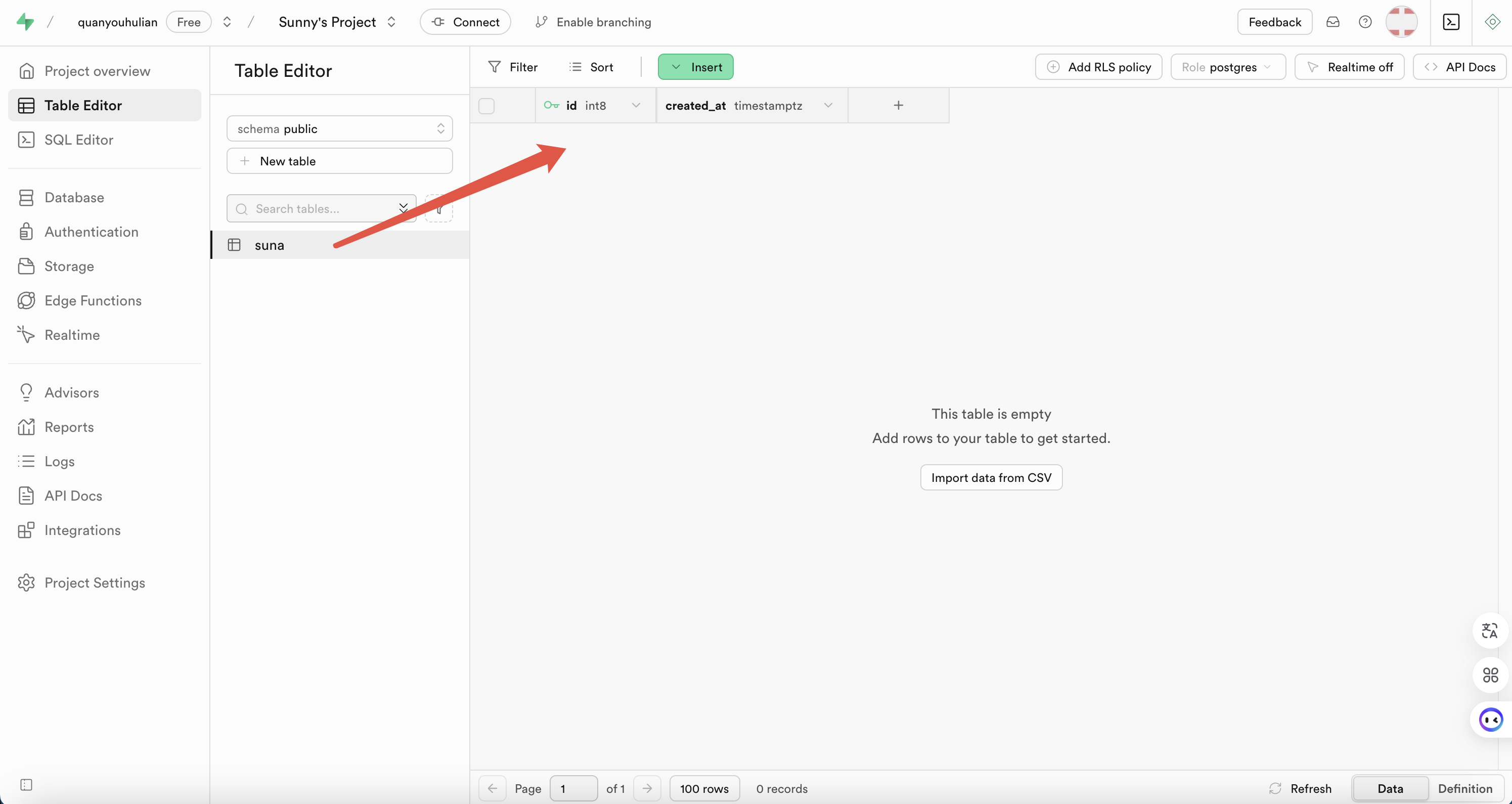 创建完projct后,就可以直接进到project主页,点击Table Editor新建表