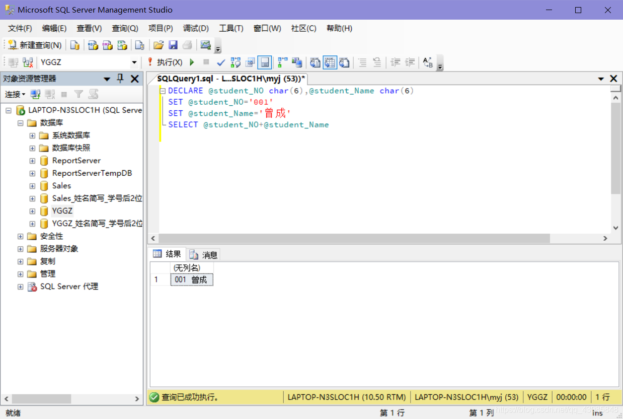 例1:创建两个个局部变量,前两个变量赋值后,并输出变量值(student_NO、student_Name)。