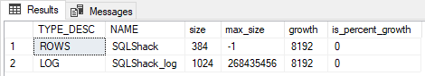 There are two files in this little database. The first one contains data rows – tables and indexes and other objects; the second one is for the log. The name column is what I need for the @FileName parameter, above. The size column is the size of the file in SQL Server pages. Recall that a page is 8K = 8192 bytes. The other columns show the max size (-1 means no limit) and growth factor, in pages, unless the column is_percent_growth = 1, in which case the growth is in percent.