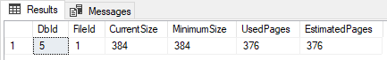 It shows the current size (after shrinking), the minimum size this database could be, the current number of used pages and the estimated minimum size after shrinking. Why are there 8 more pages in the current size than the actual used pages? That’s partially because SQL Server allocates space in extents which are 64KB in size, or 8, 8KB pages. SQL Server has also reserved one extent for housekeeping.