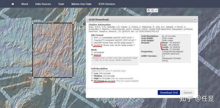 我的专栏文章海洋地球科学开放数据库列举了一些实用的数据库。如下图,我们首先从GMRT选取下载一段高精度的Arc ASCII格式的多波束文件MAR.asc。