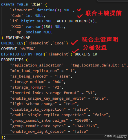 6.Unique模式建表:指定UNIQUE KEY唯一键和DISTRIBUTED分桶,可以都用联合主键字段,查询更快