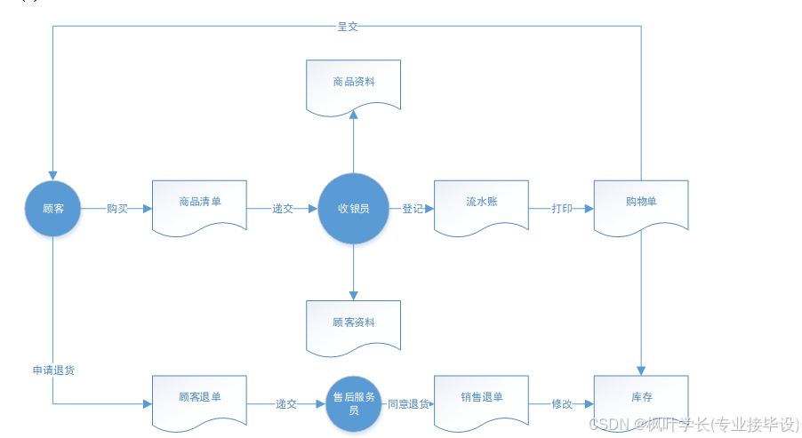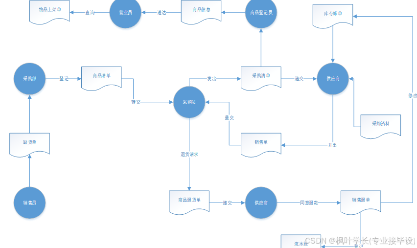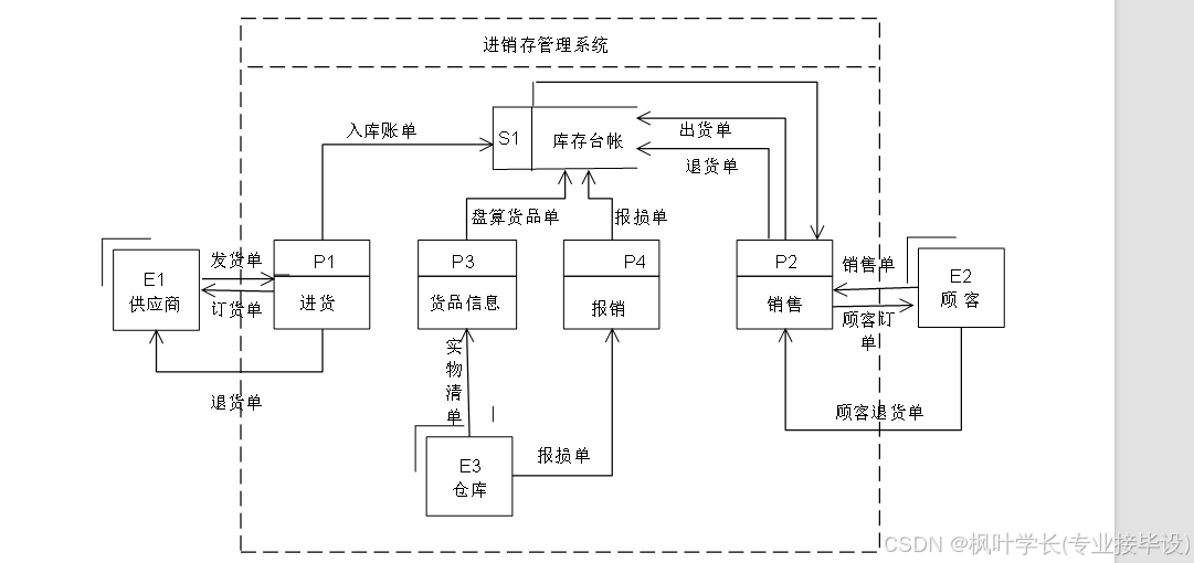 确定系统的主要处理功能,可以将系统分为进货管理、库存管理、销售管理等几部分。再确定各个输入和输出的数据流的以及与之相关的数据结构,为各个数据流、报表命名