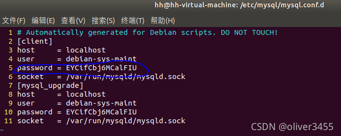 输入 sudo vim /etc/mysql/debian.cnf