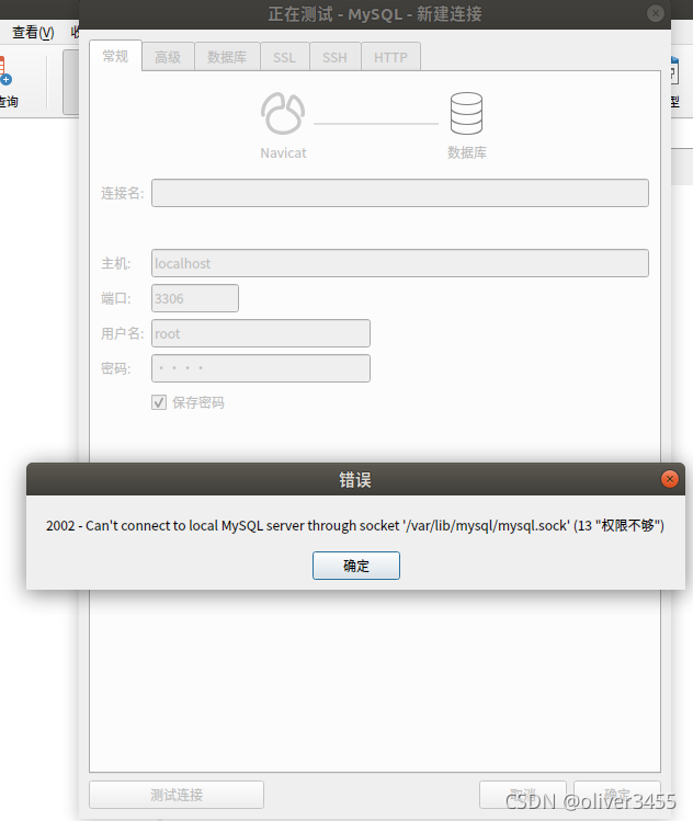 注意连接的时候,如果是之前账号密码已经改了,现在主机如果还用localhost,那么就还提示下面这个错误:2002 - Can't connect to local MySQL server through socket '/var/lib/mysql/mysql.sock' (13 "权限不够")