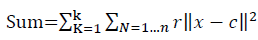 直接根据Sum确定r和c来使Sum最小化并不容易,但可以采用迭代方法:先给一个初始c数据点,选择最优的一群r,可以直观看出只要将这n个数据点归类到离它最近的中心就能保证Sum最小。