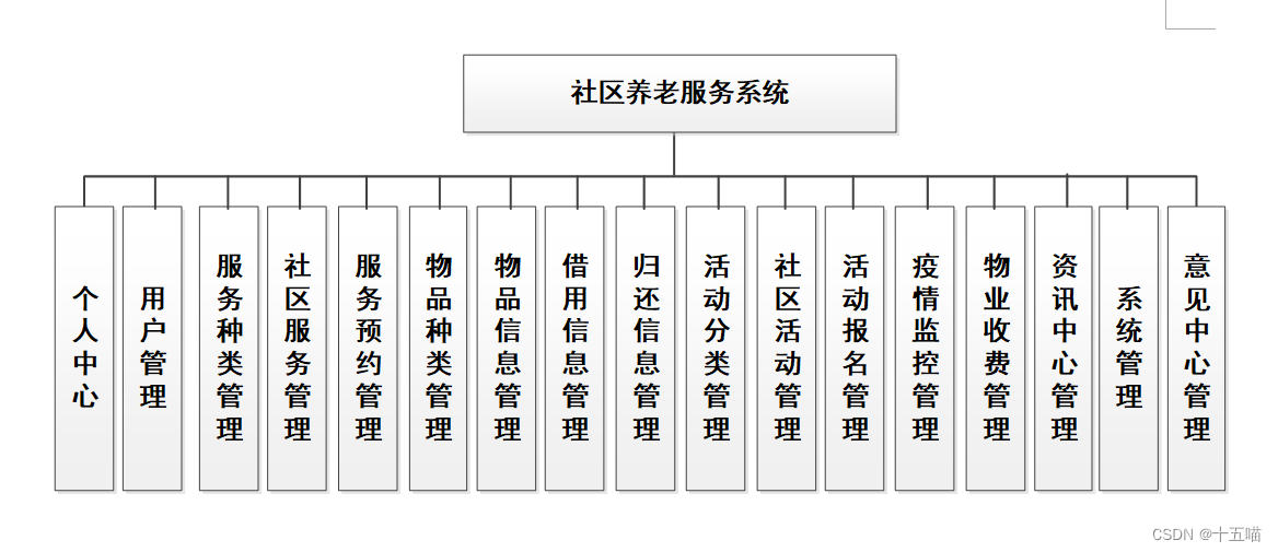 社区养老服务系统有管理员,用户两个角色。管理员功能有个人中心,用户管理,服务种类管理,社区服务管理,服务预约管理,物品种类管理,物品信息管理,借用信息管理,归还信息管理,活动分离管理,社区活动管理,活动报名管理,疫情监控管理,物业收费管理,资讯中心管理,意见中心管理,系统管理。用户可以注册登录,查看管理员发布的各中心信息,可以服务预约,借用归还,活动报名,发布自己的疫情监控信息,查看物业收费等操作