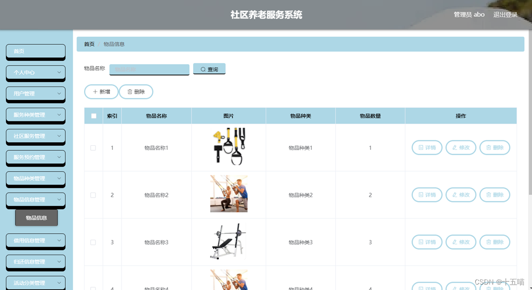 如图5.4显示的就是物品信息管理页面,管理员可以对物品信息进行添加修改删除查询操作。