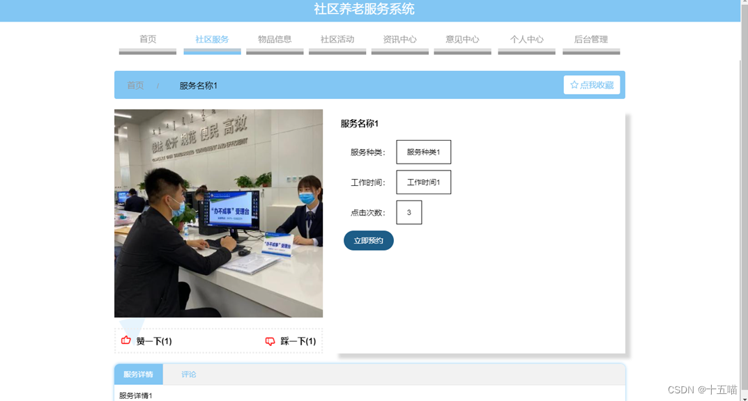 如图5.5显示的就是社区服务页面,用户注册登录后可以在社区服务信息里面预约和评论。