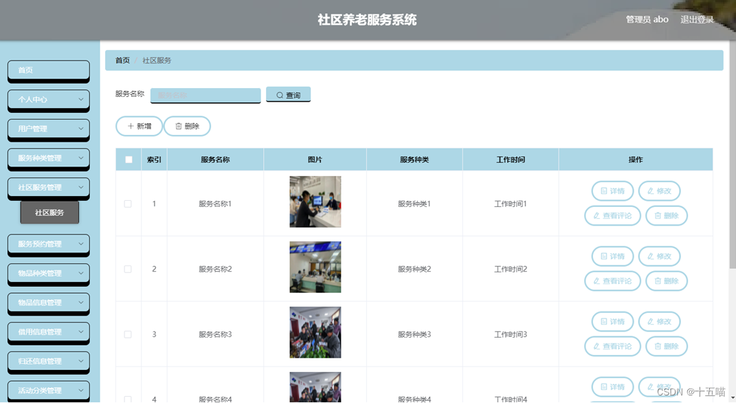 如图5.2显示的就是服务种类管理页面,管理员可以对服务种类进行添加,修改,删除,查询操作。