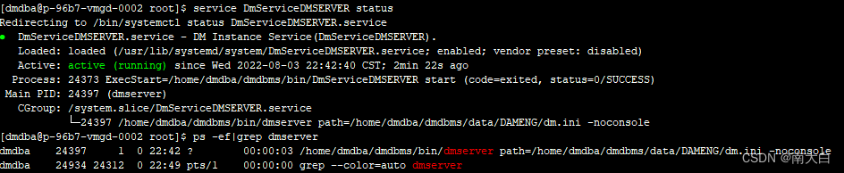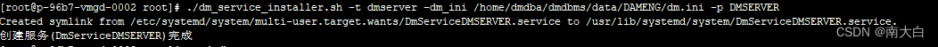 命令:./dm_service_installer.sh -t dmserver -dm_ini /home/dmdba/dmdbms/data/DAMENG/dm.ini -p DMSERVER