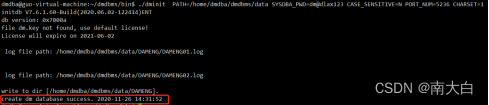 命令:./dminit PATH=/home/dmdba/dmdbms/data SYSDBA_PWD=dm@dx123 CASE_SENSITIVE=N PORT_NUM=5236 CHARSET=1