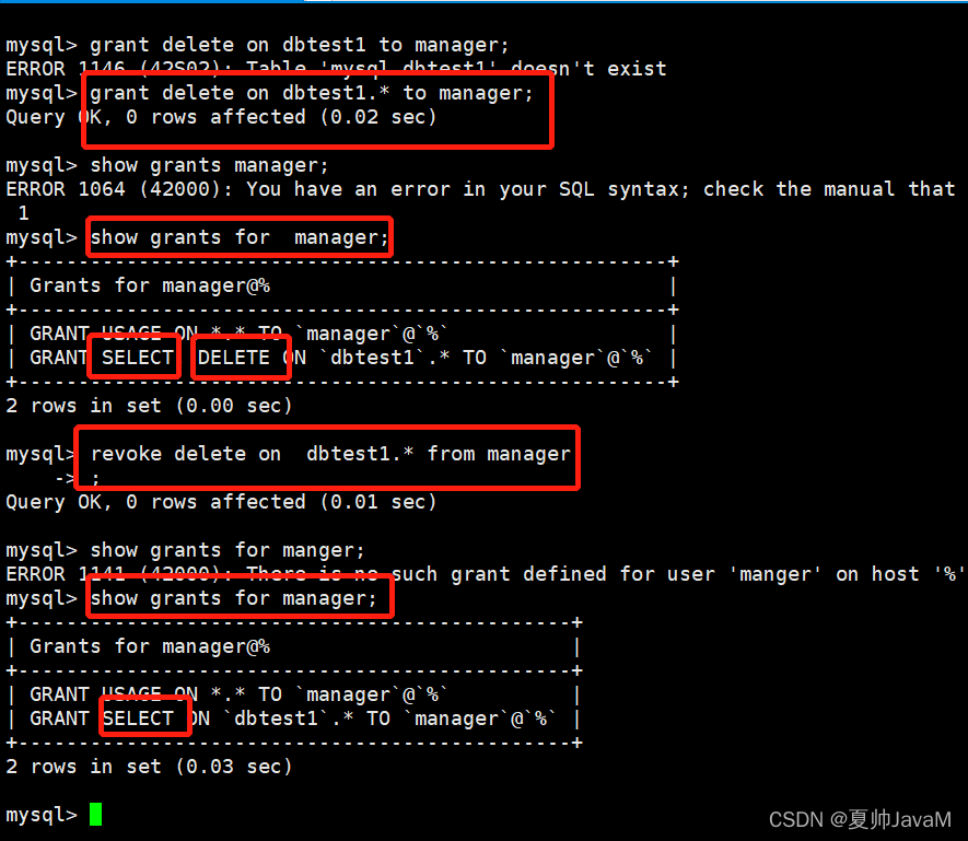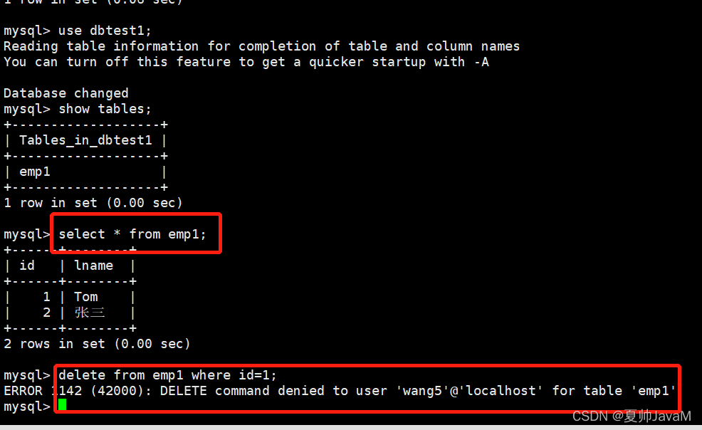 那么现在wang5已经被赋予manager角色,我们知道manager角色只是有select的权限。我们做如下操作