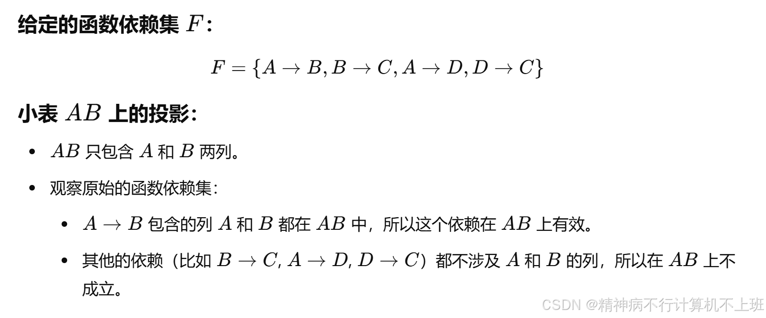 - AB小表:函数依赖 A→B在AB上成立,但其他依赖(例如 B→C,A→D 等)并不成立,因为它们不涉及AB中的列。