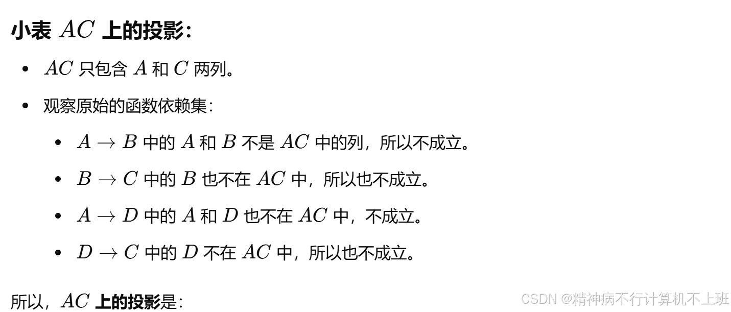 - AC这个小表只涉及到A和C,那么 A→C会是它的投影依赖。