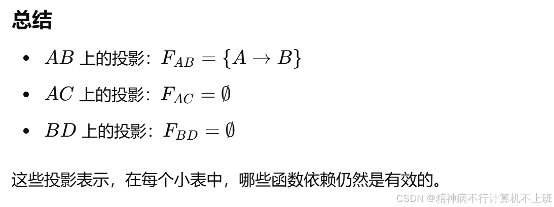 - 根据投影的结果,我们可以看到,并不是每个小表都保持了原始函数依赖集 FFF 中的所有依赖。某些依赖在某些小表中无法保持,甚至在合并这些小表时也无法完全恢复原始的依赖关系。