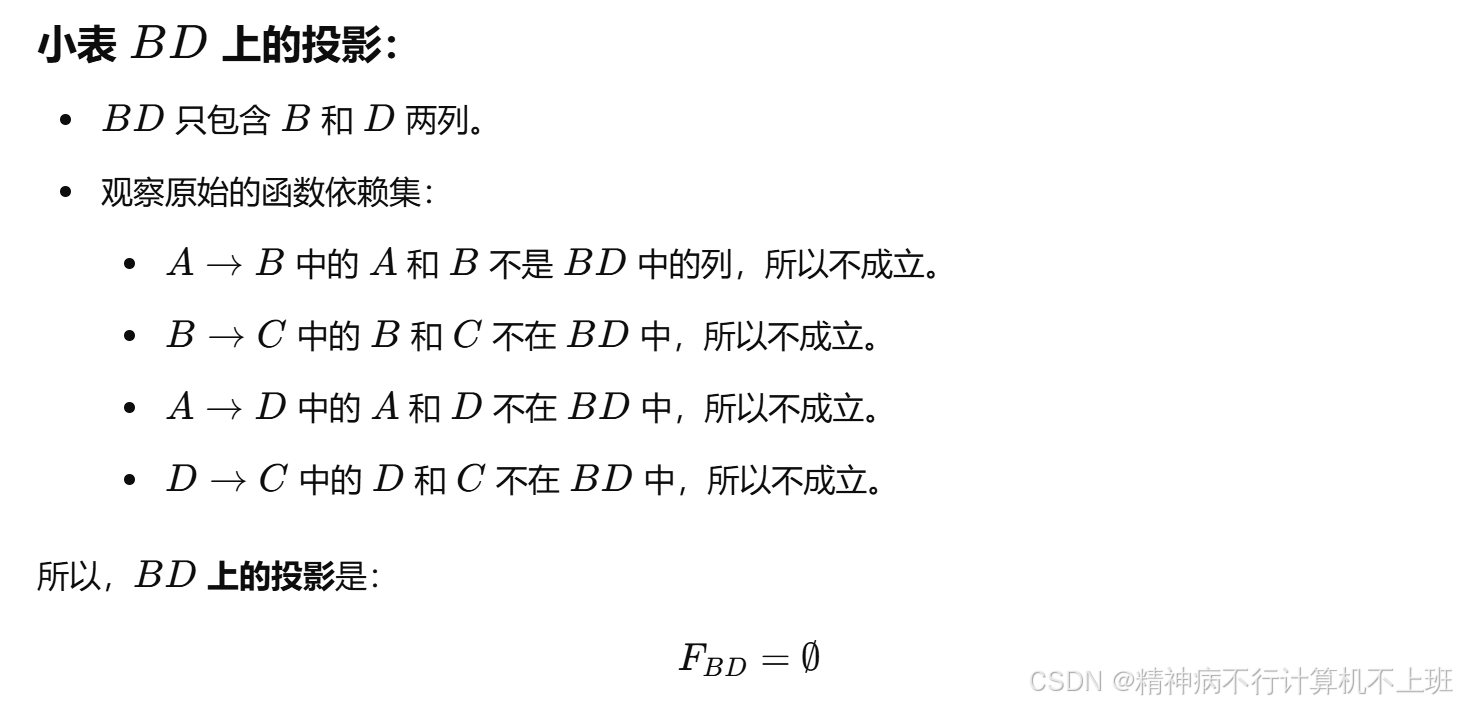 投影的作用是让我们从原始的函数依赖(FD)集中提取出每个小表的“投影”函数依赖。