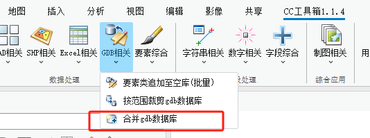 如上图所示,在【数据处理】组—【GDB相关】面板下,点击【合并gdb数据库】工具。