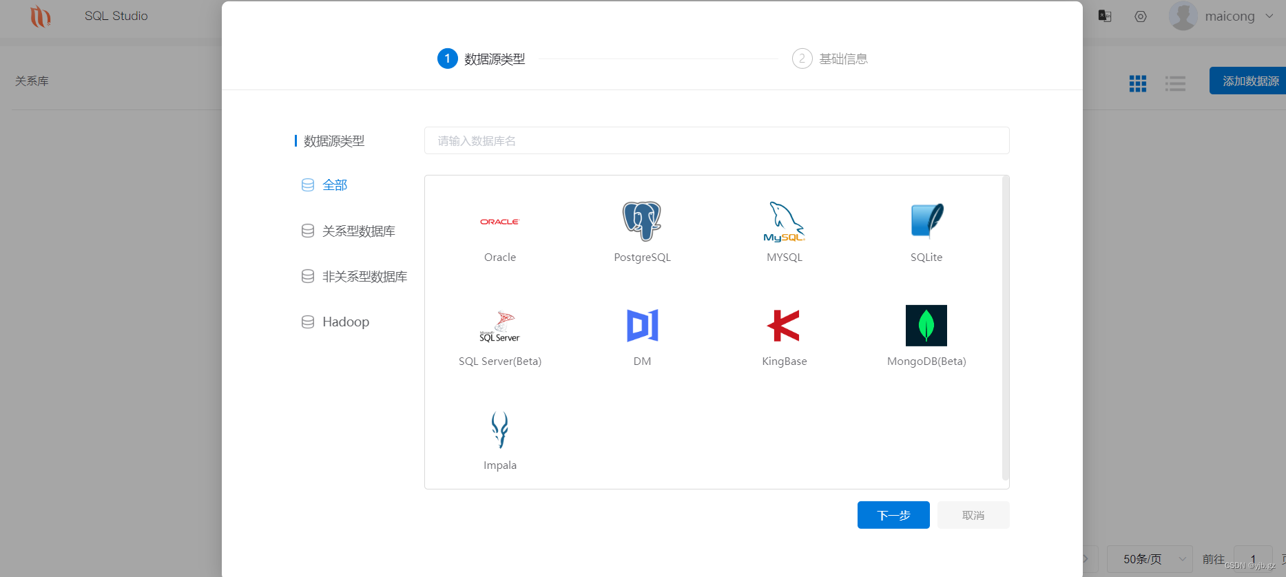 SQL Studio基于daas的服务模式,启动服务后,可在web端进行数据库连接操作 ,支持常见的数据库连接。