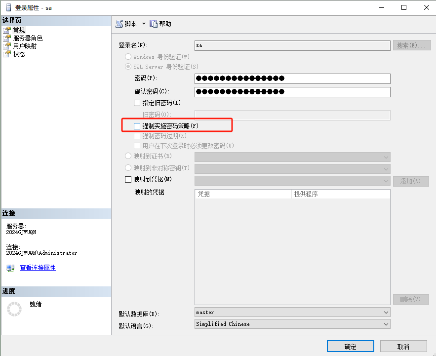 2,以Windows身份验证登录后,左侧点击安全性-登录名-sa,选中SA鼠标右键并选择属性进入属性页面。属性页面选择常规,然后密码框里输入新密码,并取消勾选强制实施密码策略。